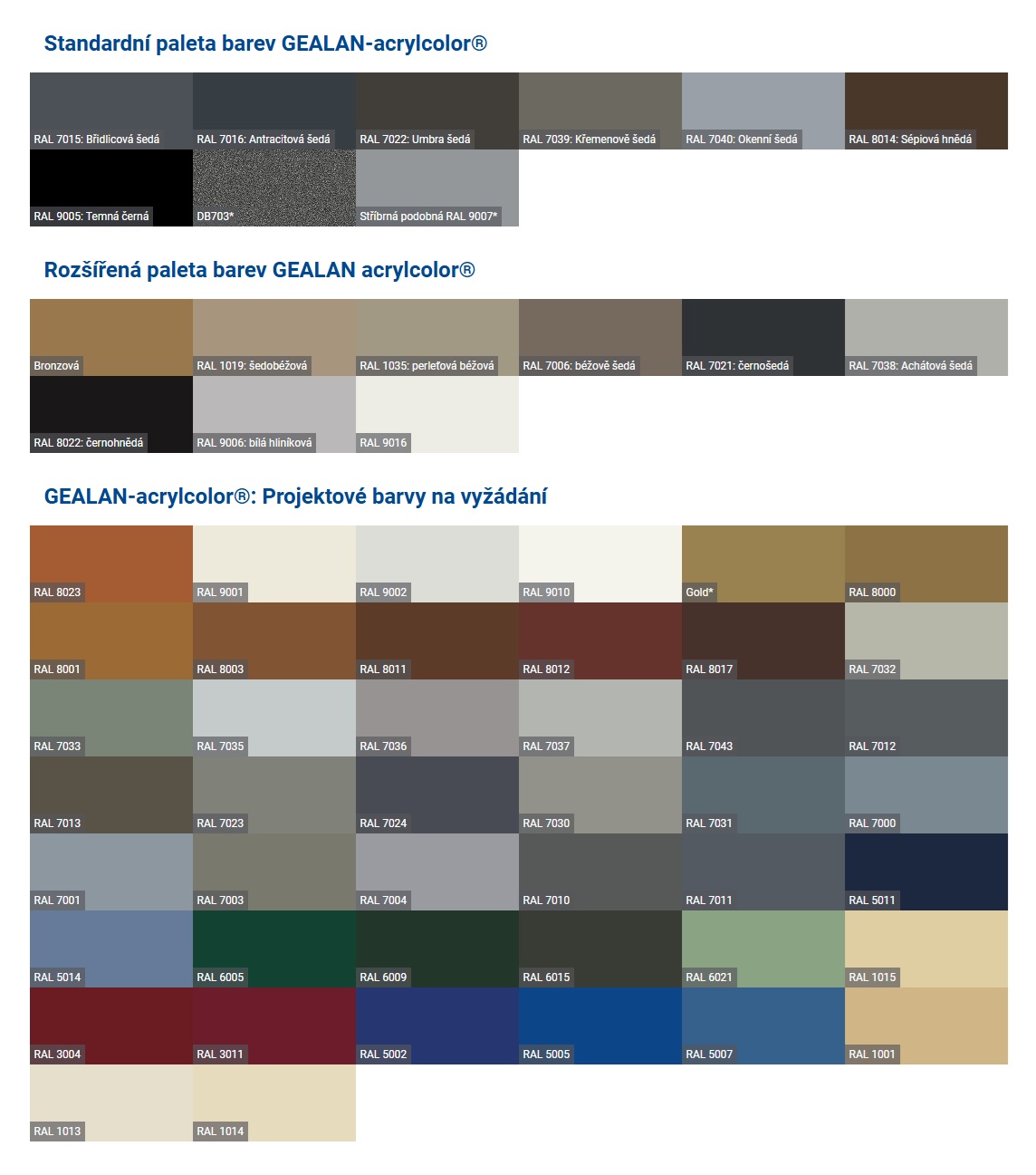 Kromě odstínů standardní, rozšířené nebo speciální řady jsou k dispozici další dvě možnosti barevného provedení GEALAN-acrylcolor®. Ve společnosti GEALAN nabízíme výhradně metalické barvy a s tmavým základním tělesem vytváříme základ pro zcela tmavé okenní profily.